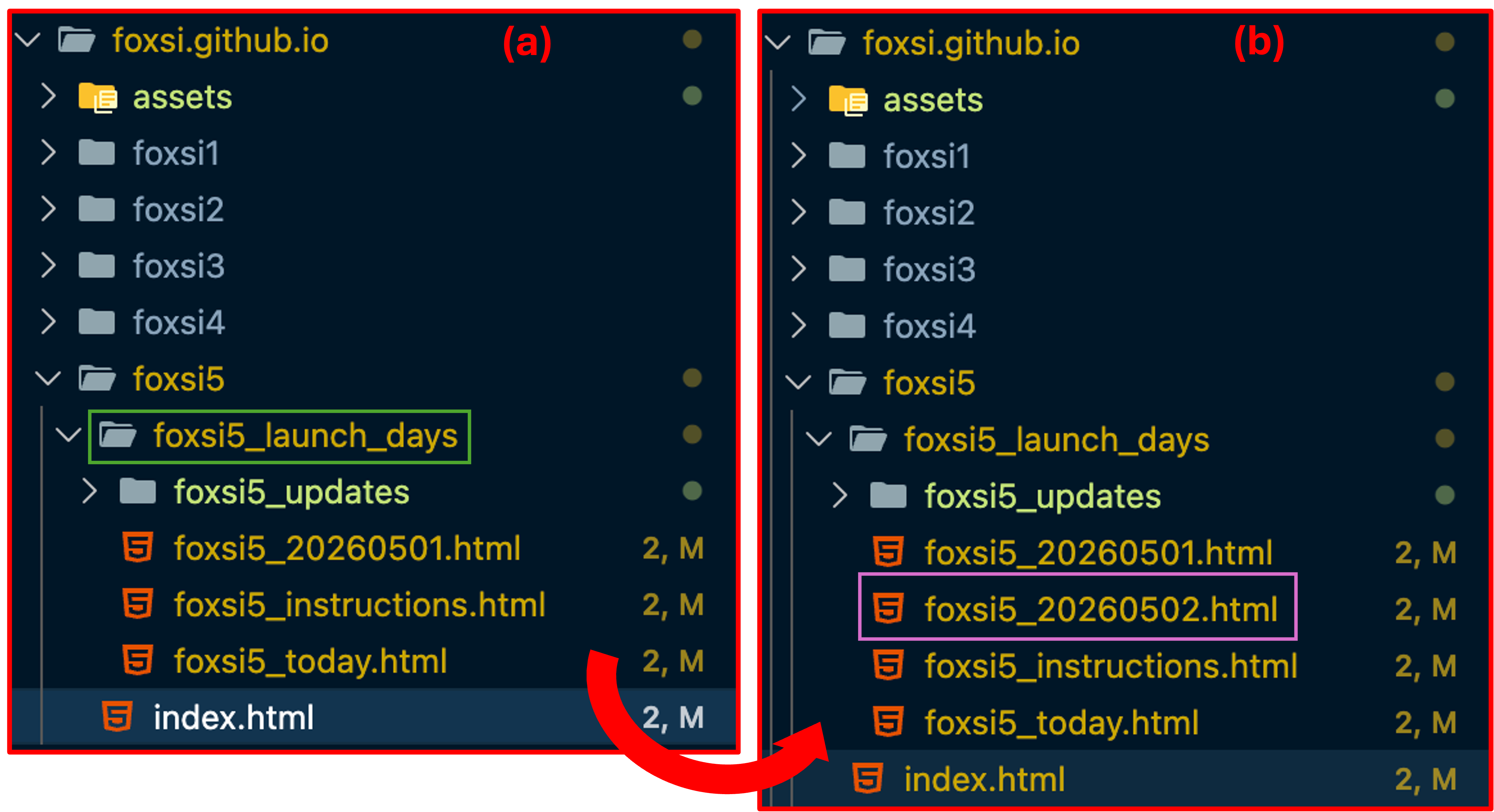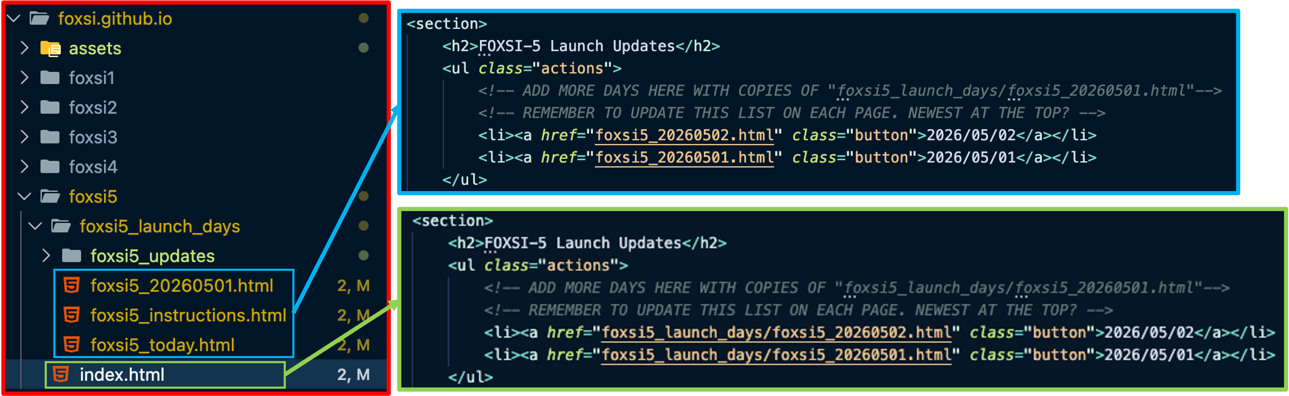 This page will detail how and where to access the HTML code to add a new FOXSI-5 launch plan update page.