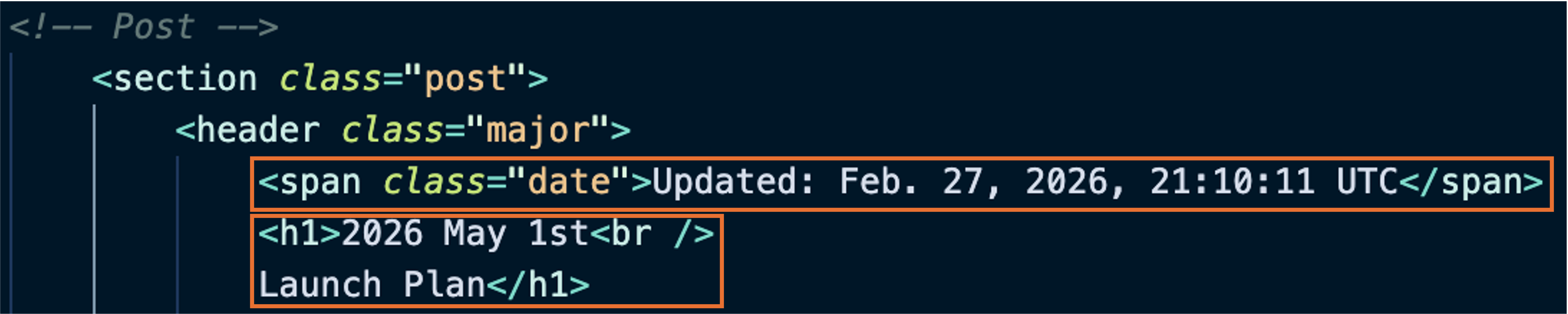 Since we're using the foxsi5_20260501.html file as a template, we'll want to update the references to May 1st, 2026 and the reference to the time this page was last updated.